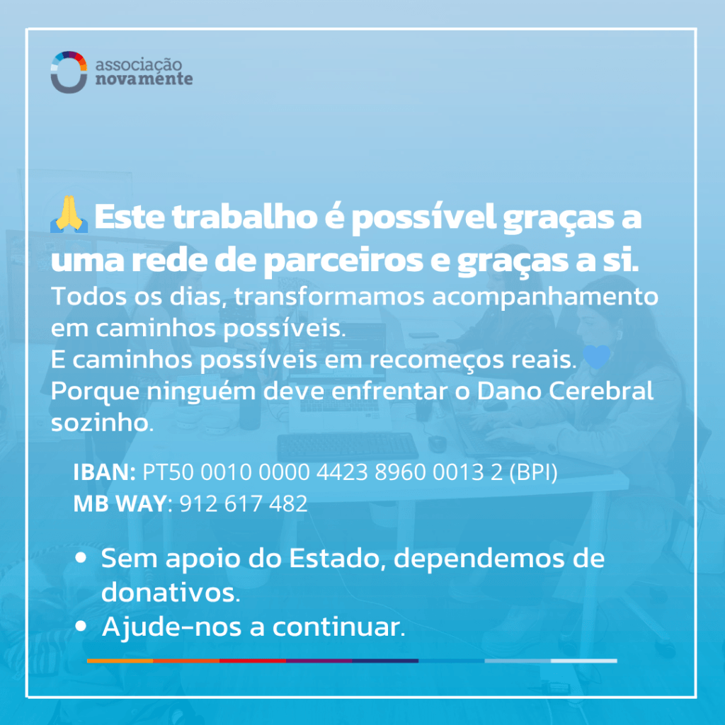 Na Associação Novamente trabalhamos diariamente para que nenhuma família se sinta só, para proporcionarmos o melhor acompanhamento possível a todos os que precisam da nossa ajuda porque sofreram um dano cerebral adquirido.